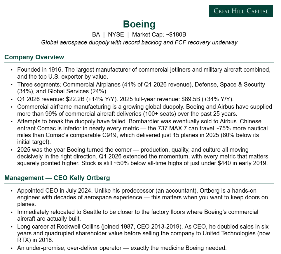 For newer readers, here’s a brief overview of the key drivers behind our Boeing thesis, as one half of the global commercial aerospace duopoly where demand has never been the issue and supply, under CEO Kelly Ortberg, is finally starting to catch up:
