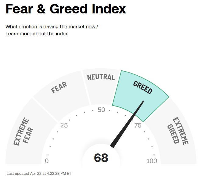 The CNN “Fear and Greed Index” ticked up to 68 this week from 47 last week. You can learn how this indicator is calculated and how it works here: (Video Explanation)