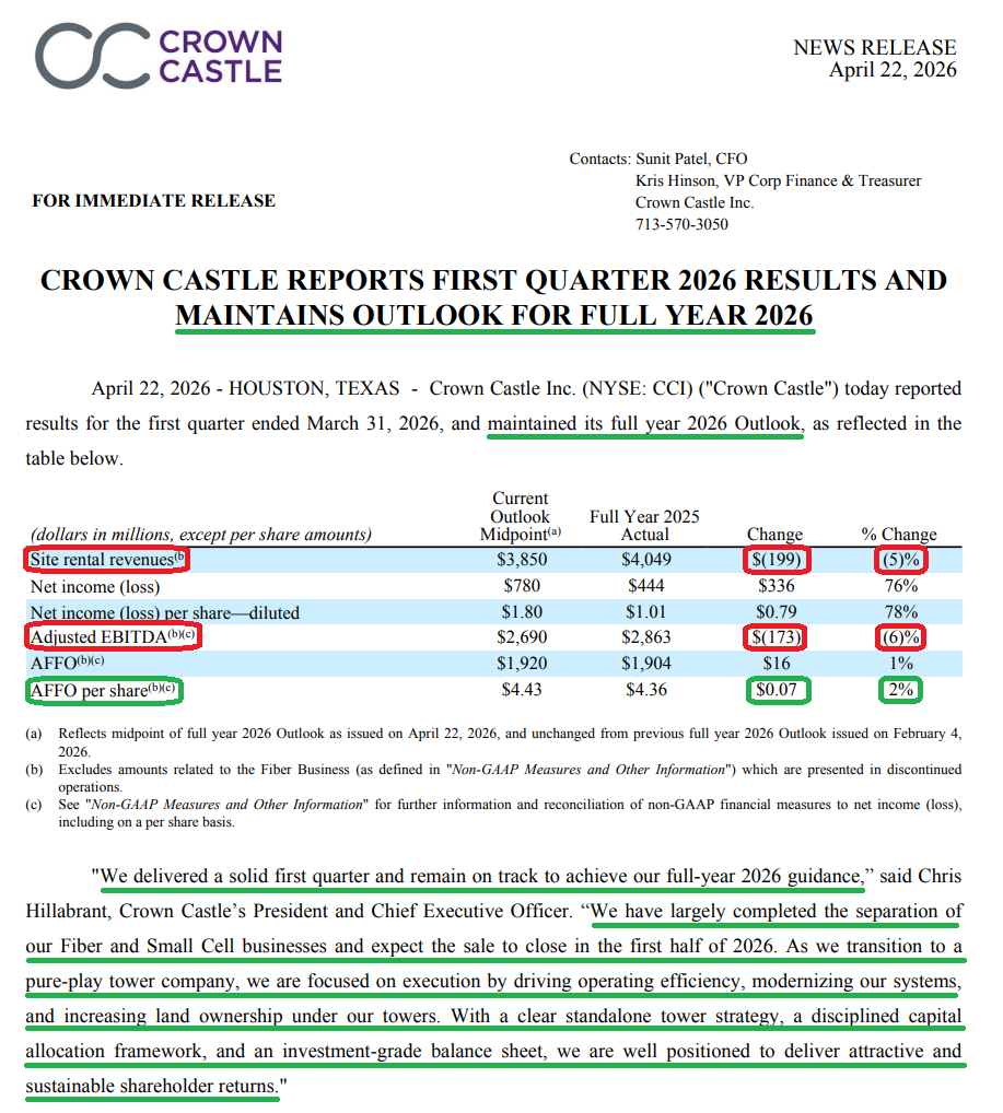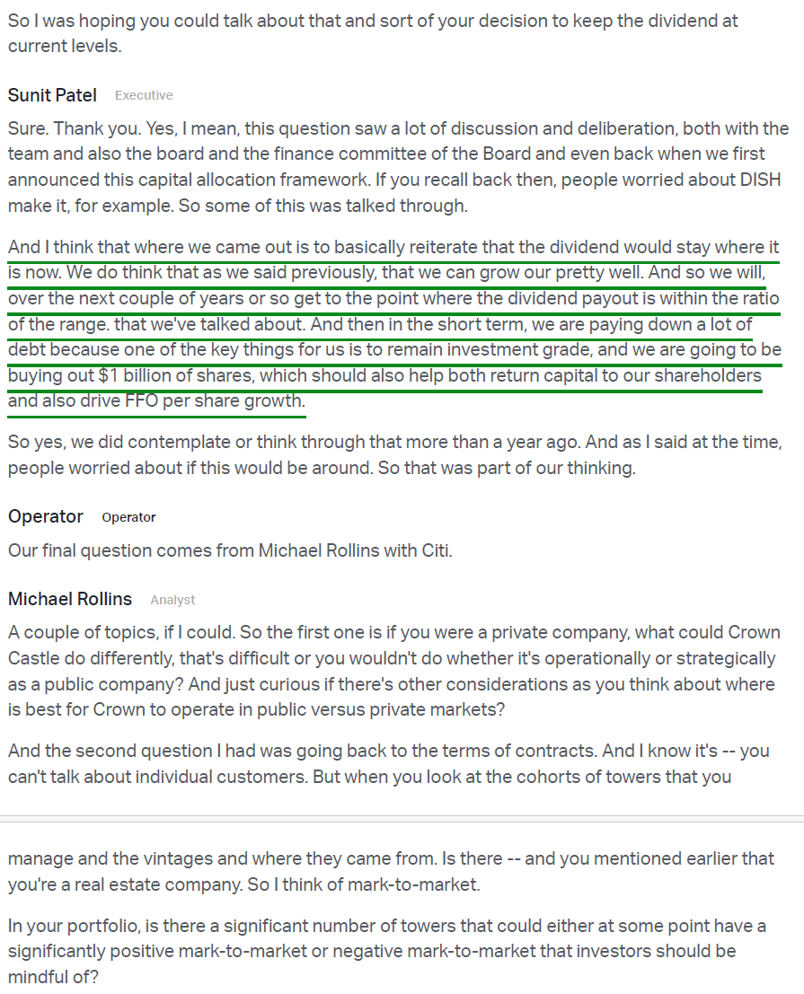 7) CCI paid $473M in common stock dividends during the quarter, or $1.0625 per share (-32% Y/Y), in line with the previously announced plan to maintain the annualized dividend at $4.25 per share (current yield of ~5.0%), with a targeted payout ratio of 75-80% of AFFO and the dividend expected to grow in line with AFFO over time.