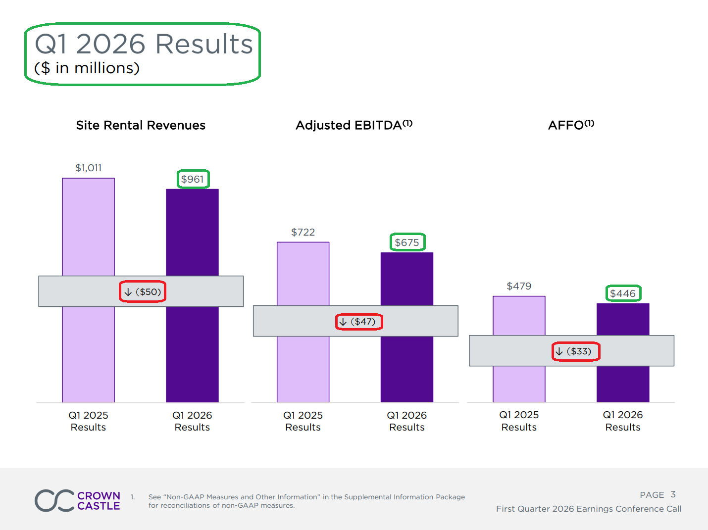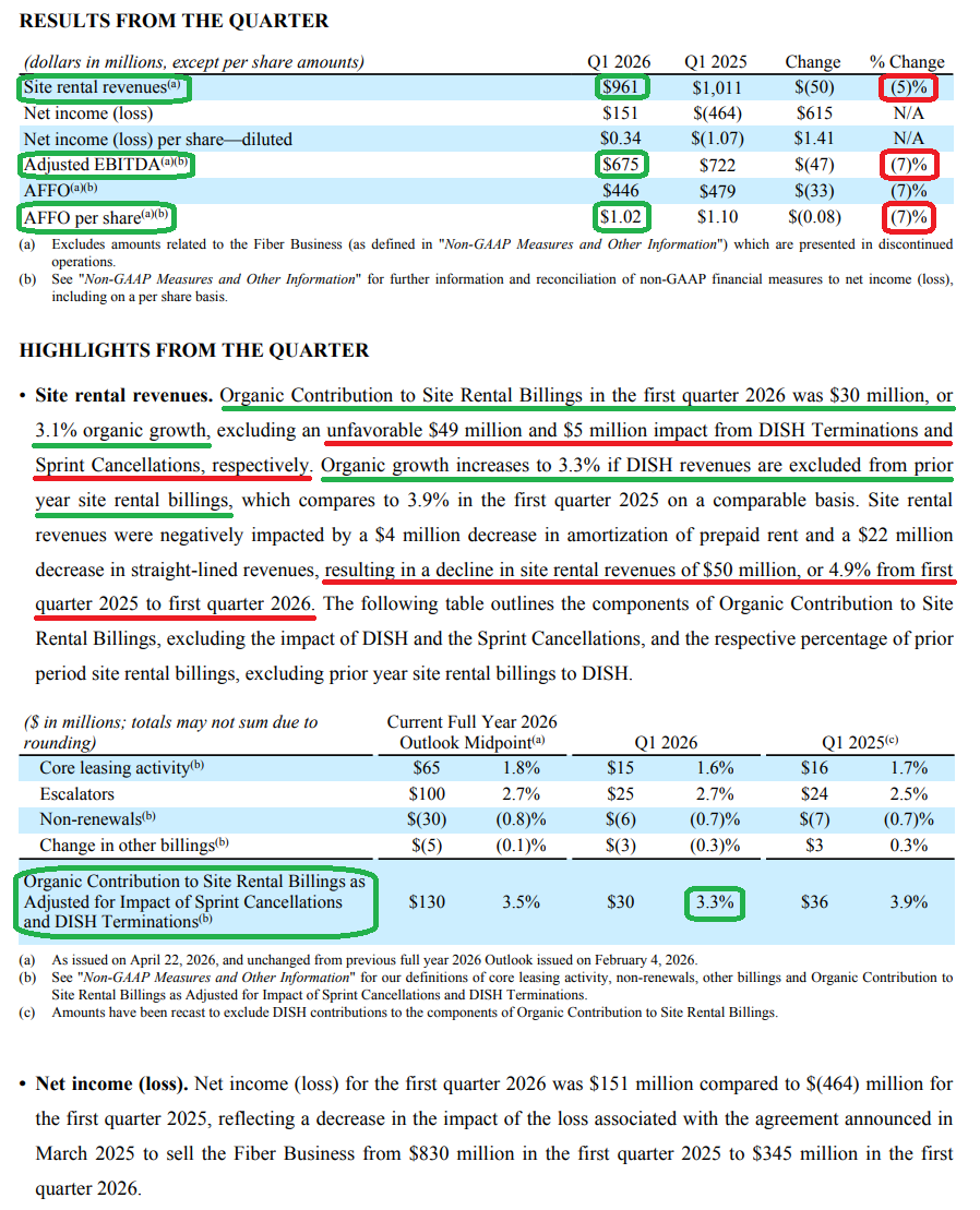 1) Q1 site rental revenue of $961M was down 5% Y/Y, with adjusted EBITDA of $675M (-7% Y/Y) and AFFO per share of $1.02 (-7% Y/Y). The Y/Y declines are almost entirely driven by the DISH termination and residual Sprint churn, masking healthy underlying leasing activity that continues to track in line with management’s full-year expectations.