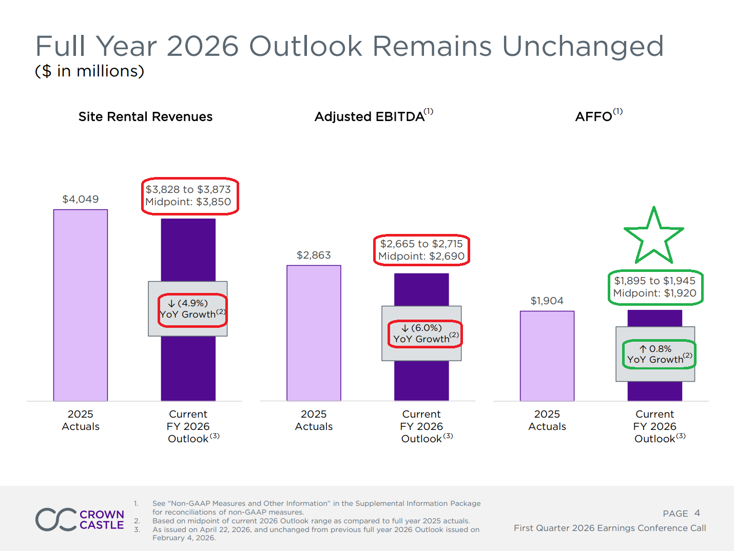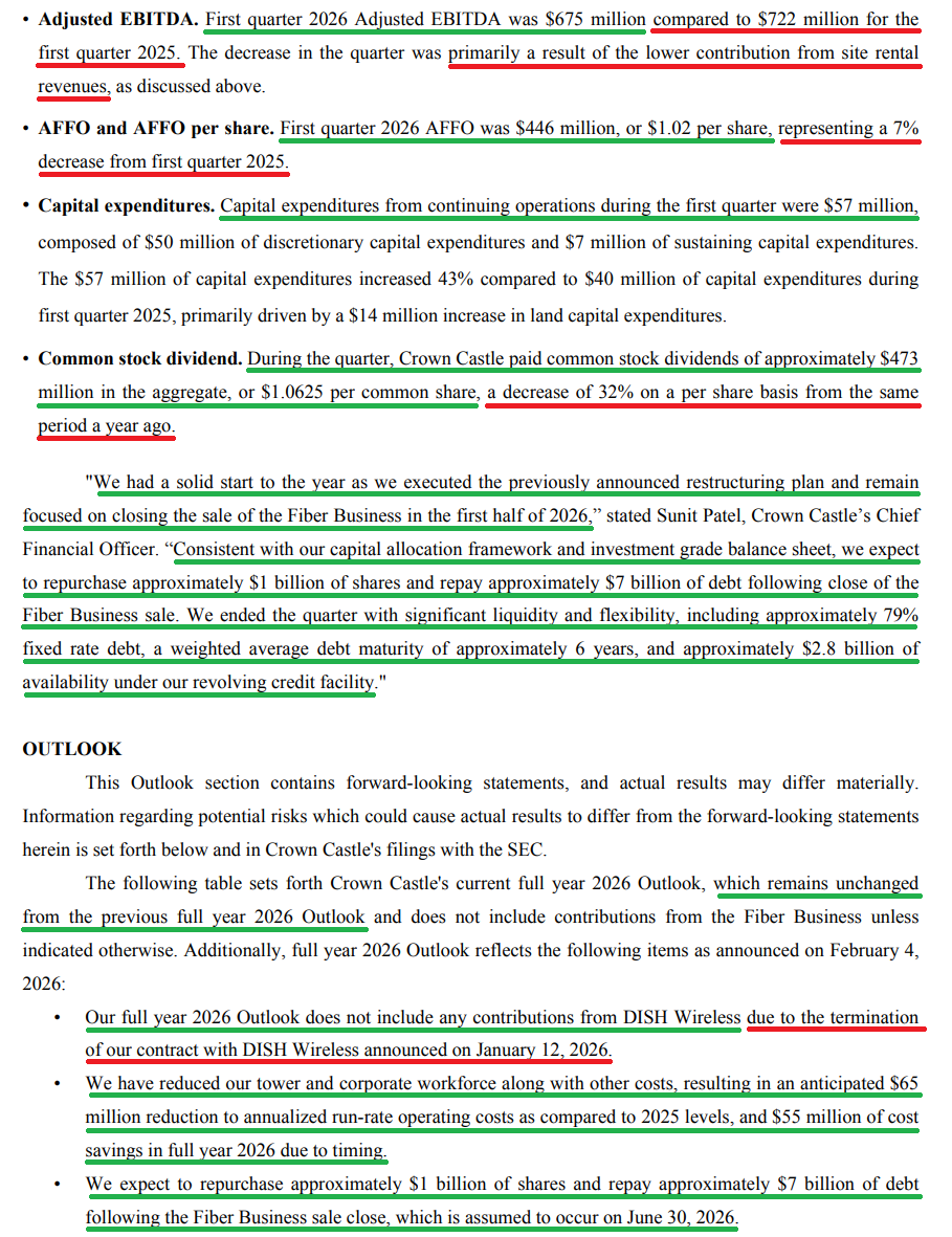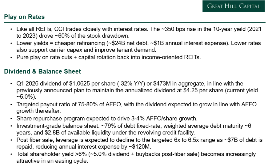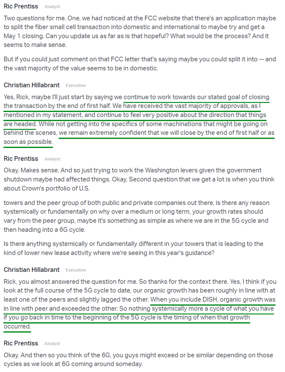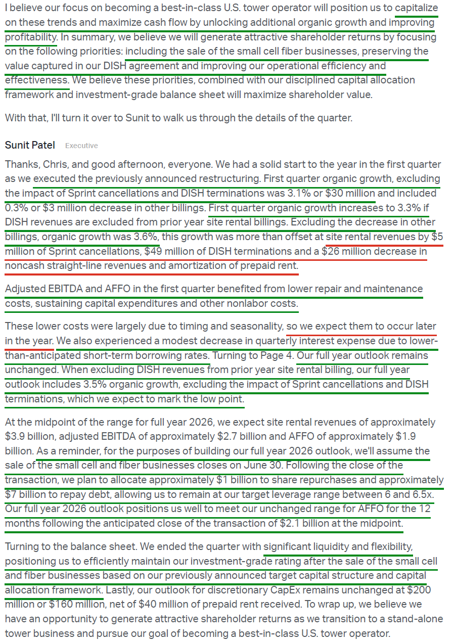 2) The $8.5B sale of the small cell and fiber solutions business remains on track to close by June 30, 2026, with management noting that almost all required approvals have been received and the operational separation of the two businesses is largely complete. Proceeds will be used to repay ~$7B of debt (reducing annual interest expense by ~$120M) and fund ~$1B in share repurchases. Upon closing, CCI will become the only publicly traded pure-play tower company focused exclusively on the US market.
