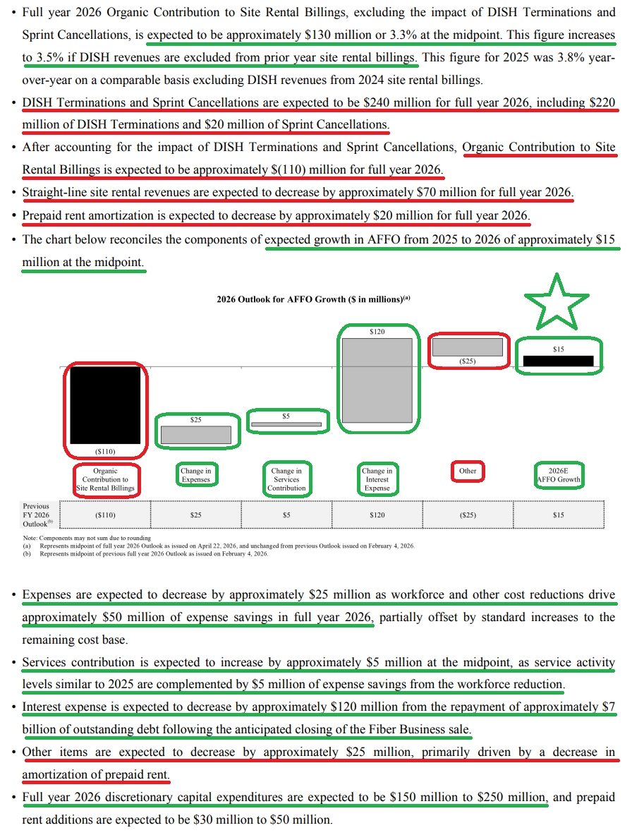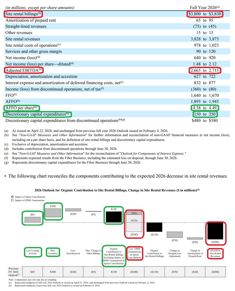 10) Management maintained full-year 2026 guidance across the board, with site rental revenues of $3.85B (-5% Y/Y), adjusted EBITDA of $2.69B (-6% Y/Y), and AFFO of $4.43 per share (+2% Y/Y) at the midpoint. The headline declines are entirely driven by the $220M DISH termination and $20M in residual Sprint cancellations, masking healthy underlying core leasing growth of +3.5% ex-churn. Importantly, AFFO is still expected to grow despite the $240M combined headwind, supported by opex savings and lower interest expense.