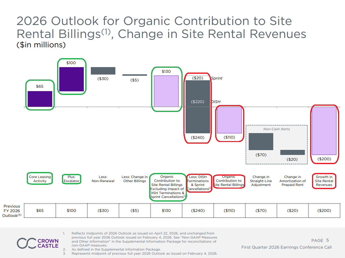 4) Organic growth came in at 3.1% for the quarter, excluding the impact of DISH terminations and Sprint cancellations, or 3.3% on an apples-to-apples basis once DISH is also removed from the prior year base. Growth was driven by +1.6% from core leasing activity and +2.7% from price escalators, partially offset by -0.7% from non-renewals and -0.3% from other billings, compared to 3.9% in Q1 2025. Management continues to view FY26 as the trough year for organic growth at 3.5% ex-DISH and ex-Sprint, with improvement expected thereafter as Sprint churn fully rolls off and new spectrum deployments begin to drive leasing activity higher.