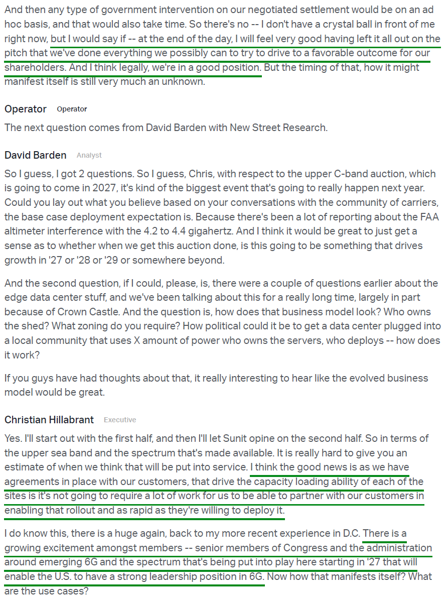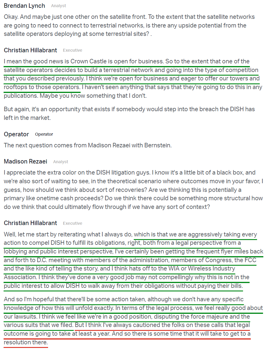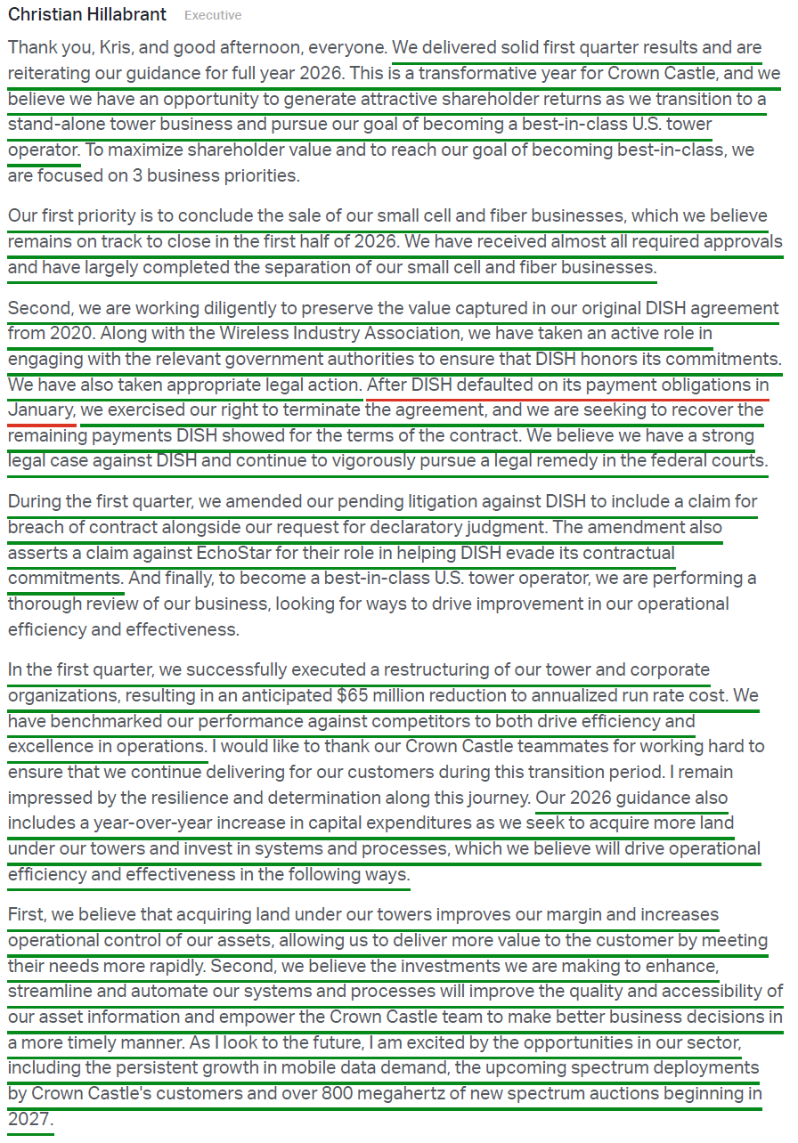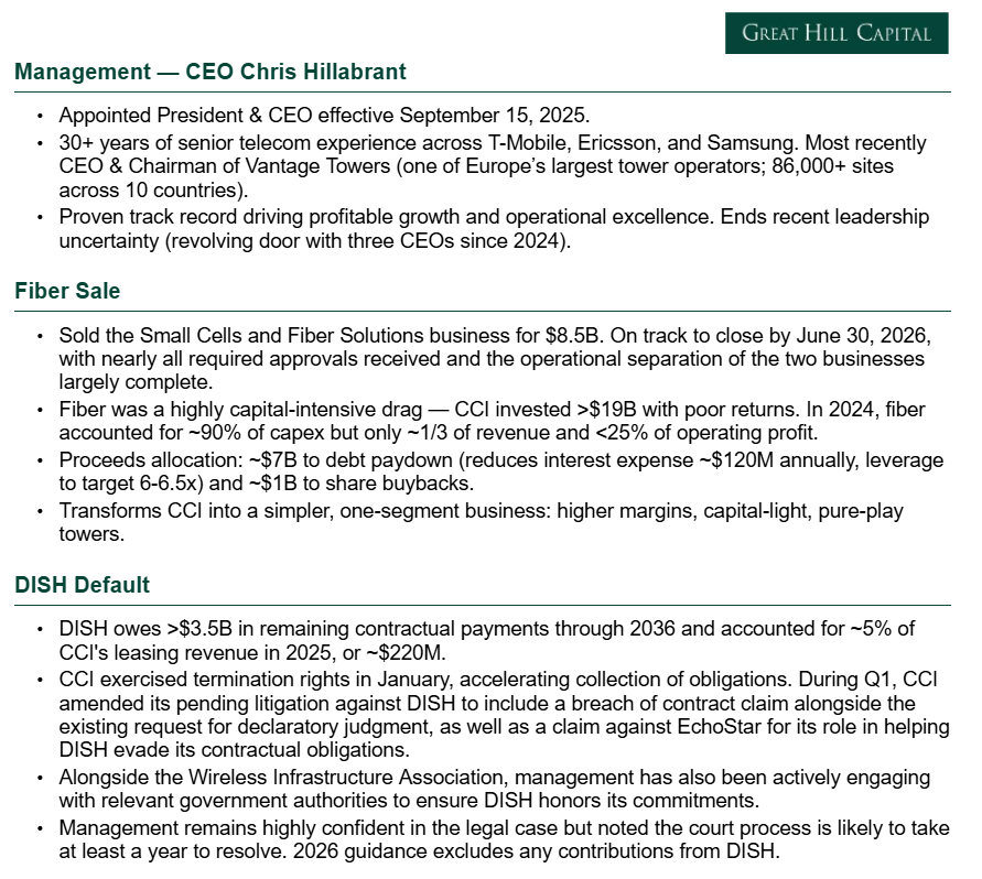 3) Following DISH’s default on its payment obligations in January, CCI terminated the agreement and is now pursuing recovery of the remaining $3.5B+ owed through 2036 via federal court. During the quarter, management amended its pending litigation against DISH to include a breach of contract claim alongside the existing request for declaratory judgment, as well as a claim against EchoStar for its role in helping DISH evade its contractual obligations. Alongside the Wireless Infrastructure Association, management has also been actively engaging with relevant government authorities to ensure DISH honors its commitments. Management remains highly confident in the legal case but noted the court process is likely to take at least a year to resolve, with 2026 guidance excluding any contributions from DISH.