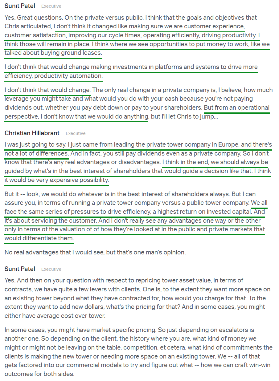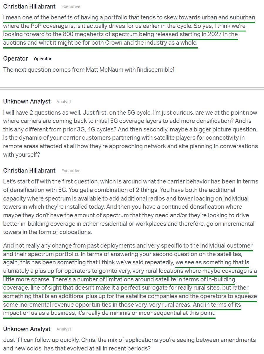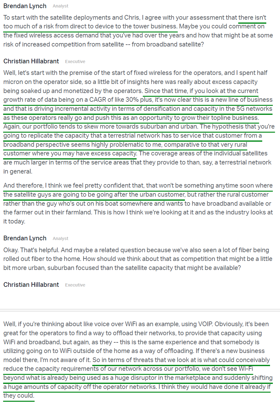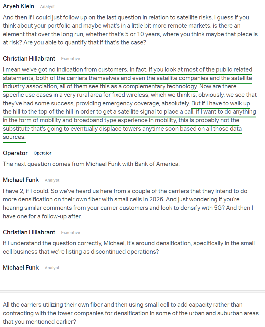 9) On the competitive threat from satellite, management noted that current offerings remain a complementary technology rather than a substitute, with meaningful limitations around in-building coverage, line of sight, and mobility use cases. Public statements from carriers, satellite operators, and the Satellite Industry Association all point to the same conclusion, with management describing the impact on CCI’s business as de minimis and tower economics remaining firmly intact.