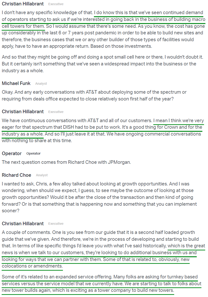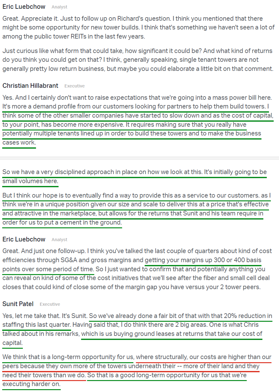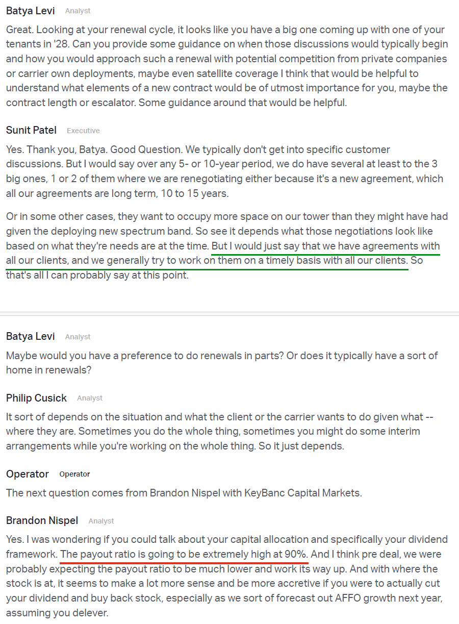 9) On the competitive threat from satellite, management noted that current offerings remain a complementary technology rather than a substitute, with meaningful limitations around in-building coverage, line of sight, and mobility use cases. Public statements from carriers, satellite operators, and the Satellite Industry Association all point to the same conclusion, with management describing the impact on CCI’s business as de minimis and tower economics remaining firmly intact.