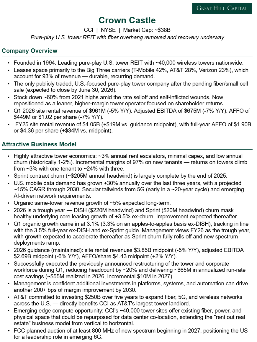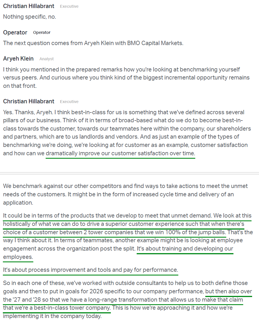 5) Management successfully executed the previously announced restructuring of the tower and corporate organizations during the quarter, reducing the workforce by ~20% and delivering an anticipated $65M reduction in annualized run-rate operating costs versus 2025 levels. Of that total, $55M is expected to be realized in FY26, with the incremental $10M realized in 2027 due to the timing of non-labor reductions following the fiber sale close. Beyond the current restructuring, management is confident that ongoing investments in platforms, systems, and automation can drive an additional 200+ bps of margin improvement by 2030.