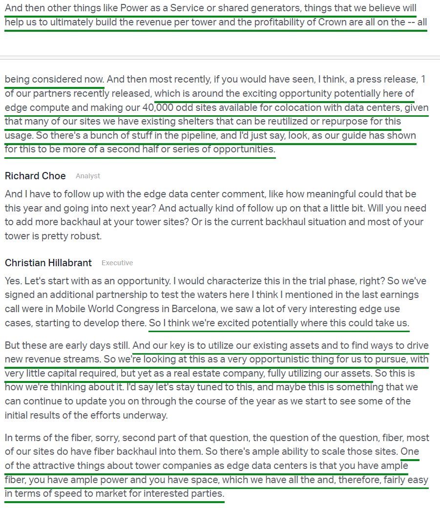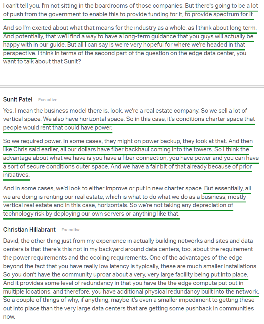 8) The long-term industry backdrop remains highly attractive, supported by persistent mobile data demand growth, upcoming spectrum deployments from CCI’s customers, and the FCC’s planned auction of at least 800 MHz of new spectrum beginning in 2027, which positions the US for a leadership role in emerging 6G. Management also pointed to an emerging edge compute opportunity, with CCI’s ~40,000 tower sites offering existing fiber, power, and physical space that could be repurposed for data center co-location, effectively extending the “rent out real estate” business model from vertical to horizontal.