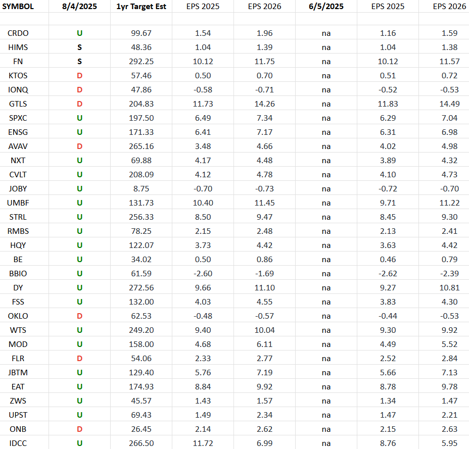 The column under the date 8/4/2025 has a letter that represents the movement in 2025 earnings estimates since the most recent print (6/5/2025). “U” means 2025 estimates are UP in the last 60 days. “D” means 2025 estimates are DOWN in the last 60 days. “S” means 2025 estimates have remained the SAME in the last 60 days. The column entitled “1yr Target Est” is the Wall Street consensus 12 month price target for each stock.