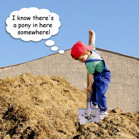 Next the psychiatrist treated the optimist. Trying to dampen his outlook, the psychiatrist took him to a room piled to the ceiling with horse manure. But instead of wrinkling his nose in disgust, the optimist emitted just the yelp of delight the psychiatrist had been hoping to hear from his brother, the pessimist. Then he clambered to the top of the pile, dropped to his knees, and began gleefully digging out scoop after scoop with his bare hands. “What do you think you’re doing?” the psychiatrist asked, just as baffled by the optimist as he had been by the pessimist. “With all this manure,” the little boy replied, beaming, “there must be a pony in here somewhere!”